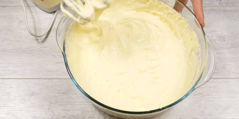 Pentru a pregati umplutura, batem ouale cu zaharul pana se albesc. Adaugam 900 gr de branza de vaci si adaugam apoi untul ramas si budinca de vanilie.