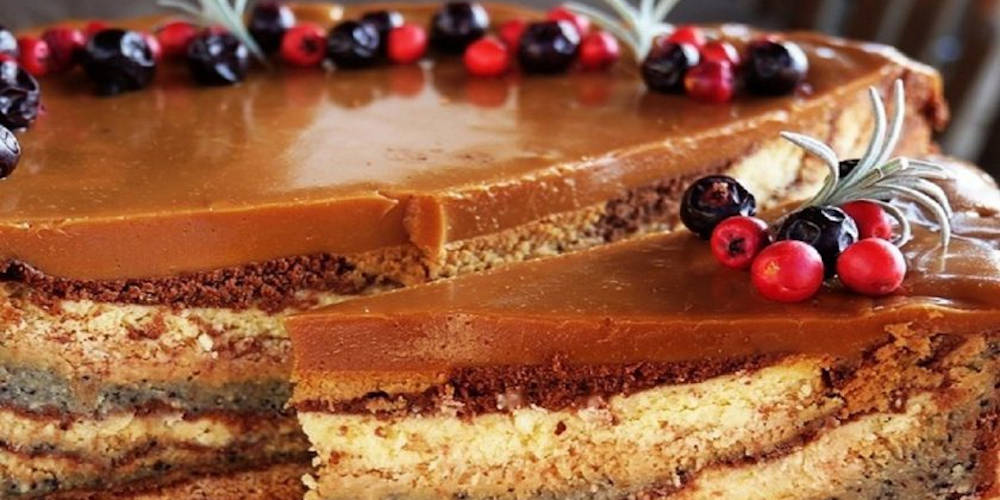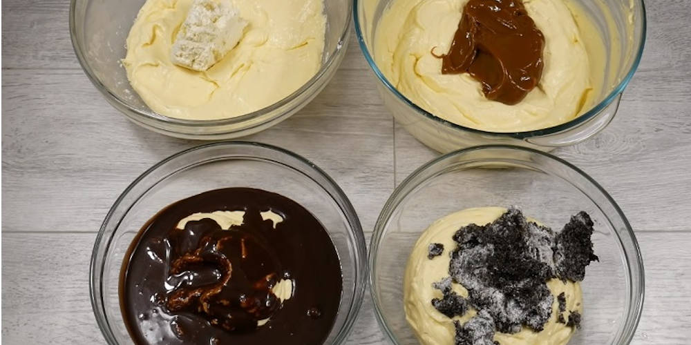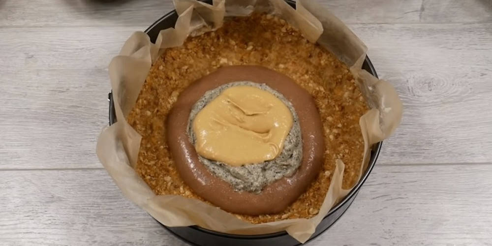Amestecam bine si impartim crema obtinuta in 4 parti egale. Intr-unul din cele 4 boluri cu crema adaugam seminte de mac amestecate cu faina, in altul adaugam 200 ml lapte condensat, in al treilea bol adaugam ciocolata neagra topita in lapte, iar in ultimul adaugam branza ramasa. Amestecam bine.