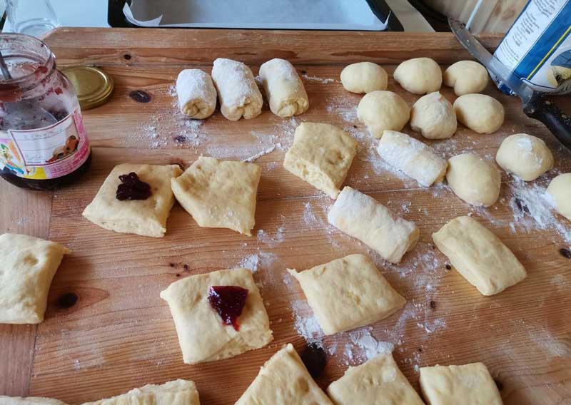 Întindeți aluatul și tăiați-l în dreptunghiuri. Puneți o linguriță de gem în mijlocul fiecărui dreptunghi și rulați-l pentru a forma chifle.