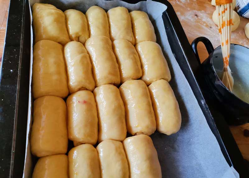 Ungeți chiflele cu unt topit înainte de a le pune în cuptor.