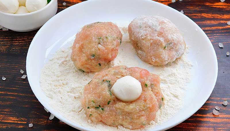 Turnați făină într-o farfurie. Udați-vă mâinile cu apă, luați o bucată de carne tocată de dimensiunea (cam cat puteti lua cu o lingura) si intinde pe palma. Așezați o mini mozzarella în centru si ridicați marginile astfel încât brânza să fie înăuntru. Se modelează chiftele, se rulează în făină.