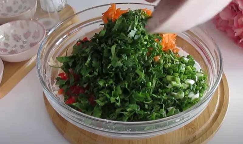 În primul rând, toacă fin ardeiul roșu, ceapa verde și pătrunjelul. Curăță și rade morcovii. Într-un castron, amestecă ouăle, iaurtul și laptele. Adaugă făina, sarea și praful de copt.