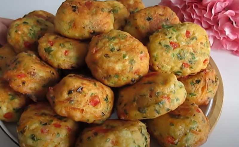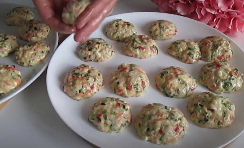 Amestecă ingredientele și toarnă legumele pregătite în aluat. Frământă aluatul cu mâinile și dă-i formă în bucăți puțin mai mari decât o nuca – trebuie sa iti ungi palmele cu putin ulei pentru a nu se prinde aluatul.
