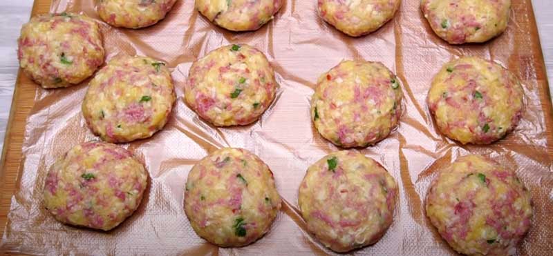 Amestecați bine compoziția pentru a obține o consistență uniformă. Formați chifteluțele și acoperiți-le cu făină sau pesmet. Prajiti chifteluțele în ulei pe ambele părți până când devin aurii.