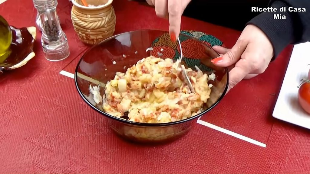O condimentăm cu sare, piper și oregano după care adăugăm și pasta de tomate, oul și amestecăm bine.