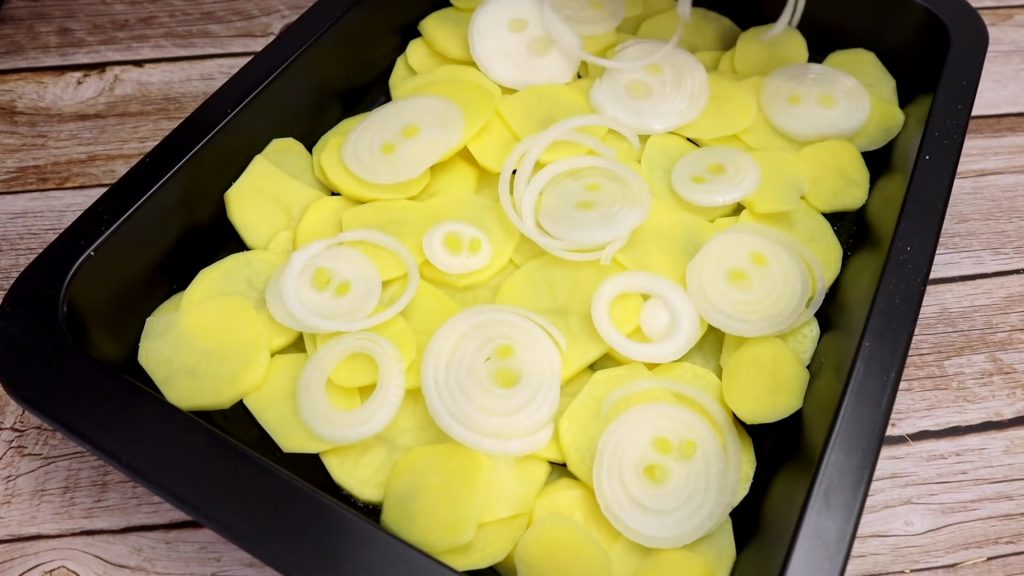 Curățăm, spălăm și tăiem cartofii felii subțiri. Curățăm, spălăm și tăiem 1 ceapă inele subțiri. Ungem o tavă cu ulei și punem în ea cartofii. Sărăm cartofii după care punem și inelele de ceapă deasupra.
