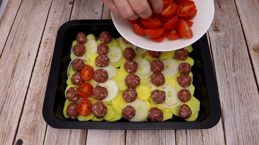 Amestecăm carnea tocată cu 1 ceapă dată pe răzătoarea mică, sare și piper. Formăm chifteluțele și le așezăm în tavă, împreună cu jumătățile de roșii.