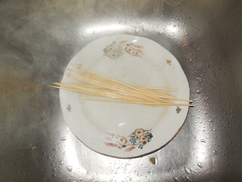 Stropiți bețele de frigărui cu apă și puneți ciupercile marinate pe ele.