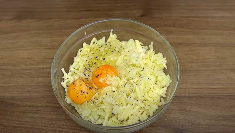 Adăugați brânza rasă peste cartofii rași. Adăugați cele 2 ouă și usturoiul presat sau tocat fin.