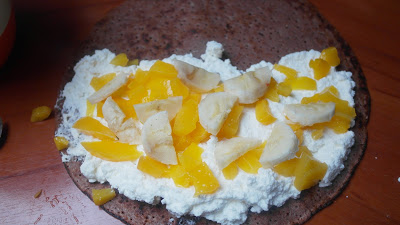 Punem frisca pe clatite si adaugam felii de fructe. La final rulam clatitele pentru a le da forma unui sul. Daca doresti poti presara zahar pudra deasupra sau poti turna ciocolata topita.