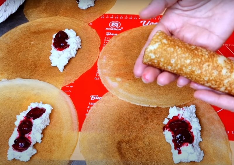 Adăugăm la umplutura de brânză compoziția de cireșe și împachetăm clătitele sub formă de plic.