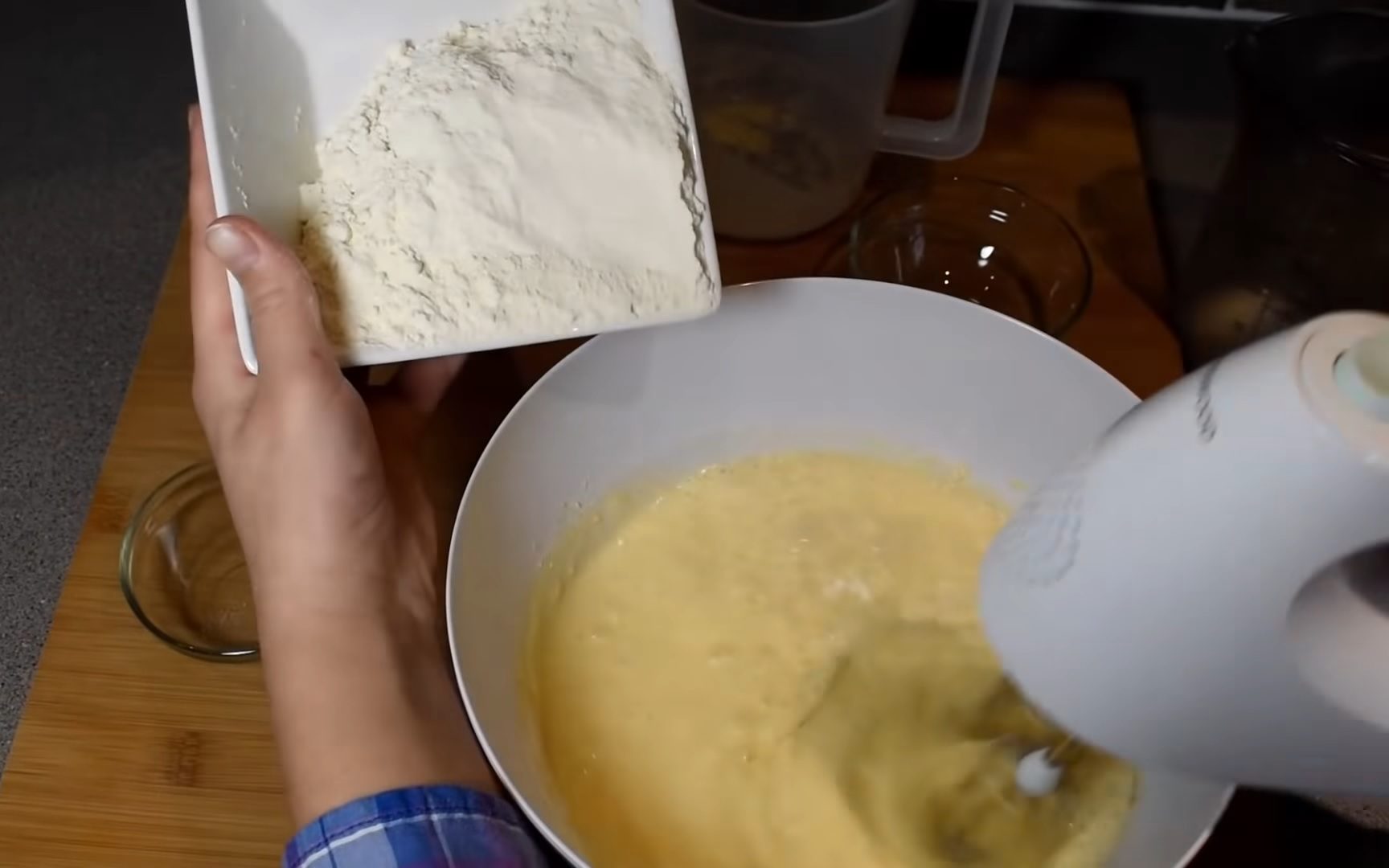 Spargem ouăle într-un bol și le mixăm cu zahărul pudră. Adăugăm zahărul vanilat, sarea, laptele și frișca lichidă. Omogenizăm, adăugăm untul și, mixând continuu, adăugăm treptat și făina.