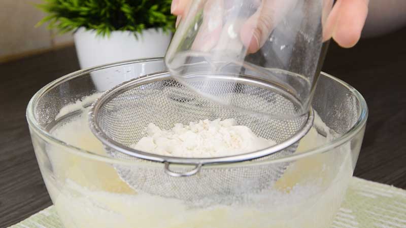 Acum vom adăuga făina aici. Adaug un pic mai mult decât jumătate din cantitatea totală. O cern neapărat și amestec bine cu un tel.