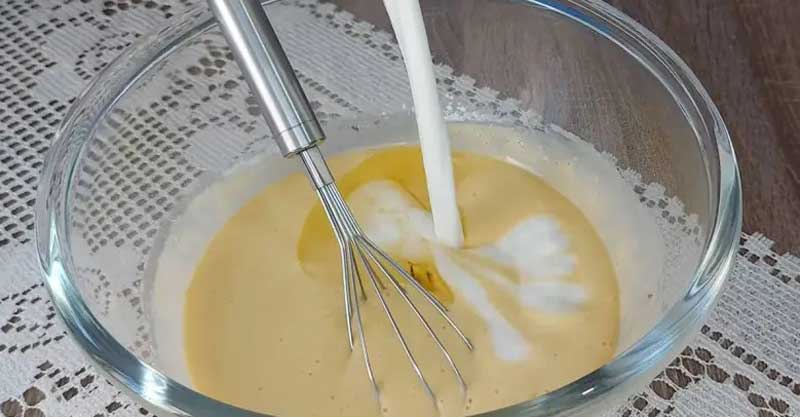 Adaug un vârf de sare și zahăr la ouă. Le bat cu mixerul până devin ușor spumoase. Torn 1/3 din lapte și cern făina. La viteză mică a mixerului, amestec aluatul până devine omogen.