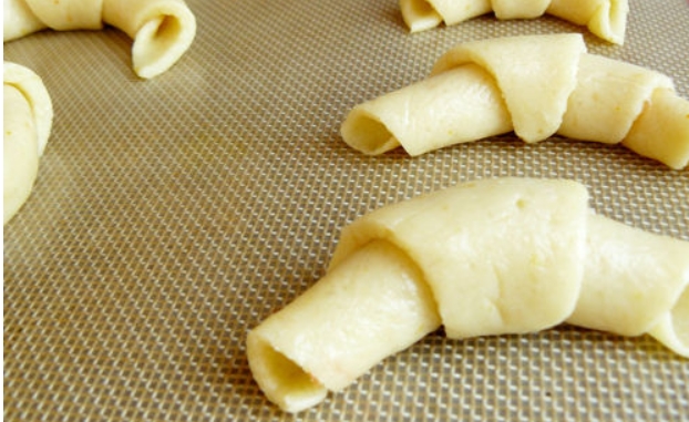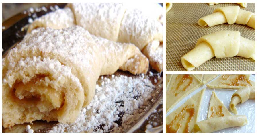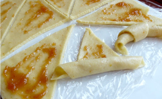 Se pune umplutura si se ruleaza sub forma de cornulete, avand grija ca varful sa ramana dedesubt ca sa nu se desprinda la copt.