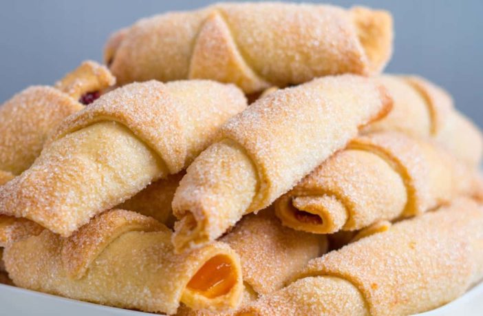 - Formăm cornuleţele, pe urmă le dăm prin zahăr şi le aranjăm pe o tavă de copt.