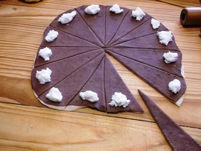 Procedați la fel cu restul aluaturilor. Așezați cercurile de cacao peste cele albe și presați ușor. Eu am folosit sucitorul pentru a le lipi mai bine. Tăiați cercurile în triunghiuri cu o rotiță de patiserie.