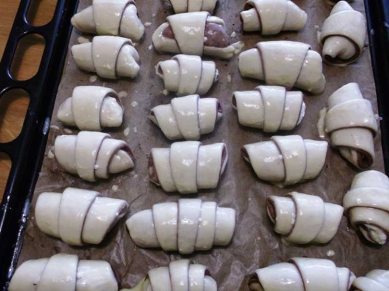 Rulați cornurile de la marginea lată spre vârful îngust. Așezați cornurile pe o tavă tapetată cu hârtie de copt și ungeți-le cu ou bătut amestecat cu smântână și presărați migdale tocate, dacă doriți.