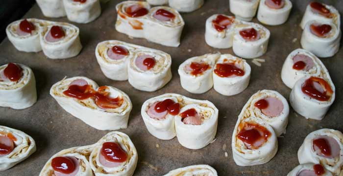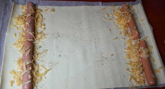 Foaia se intinde pe suprafata de lucru iar pe margini (pe latime) se pun cei 4 crenvursti/carnaciori – doi pe partea stanga si 2 pe partea dreapta. Peste carnaciori se presara cascaval din belsug si se presara condimentele pentru pizza pe toata suprafata foietajului.