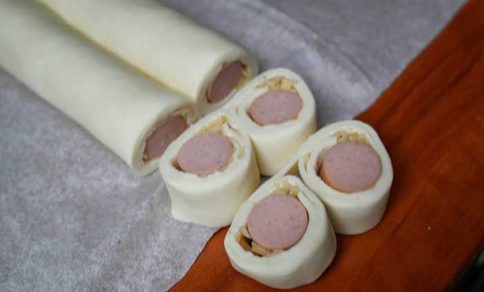 Aluatul se ruleaza spre mijloc – atat de pe stanga cat si din partea dreapta pana aceste doua rulouri se vor uni. Din rulada astfel obtinuta se taie in bucati cam de 2 cm grosime si se aseaza in tava de copt, tapetata cu hartie de copt, cu partea taiata in sus.