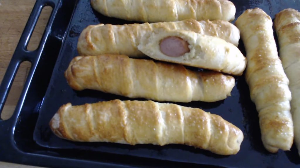 Ungem fiecare fâșie cu ou bătut după care învelim câte un crenvurști cu ele. Transferăm rulourile pe o tavă unsă cu unt. Ungem rulourile cu ou bătut, le acoperim și le lăsăm la dospit pentru 15-20 de minute.