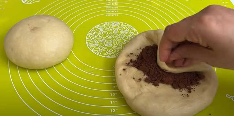 Împărțiți aluatul în două jumătăți. Amestecați 20 g de pudră de cacao într-o jumătate. Lăsați ambele jumătăți de aluat să crească timp de 20 de minute.