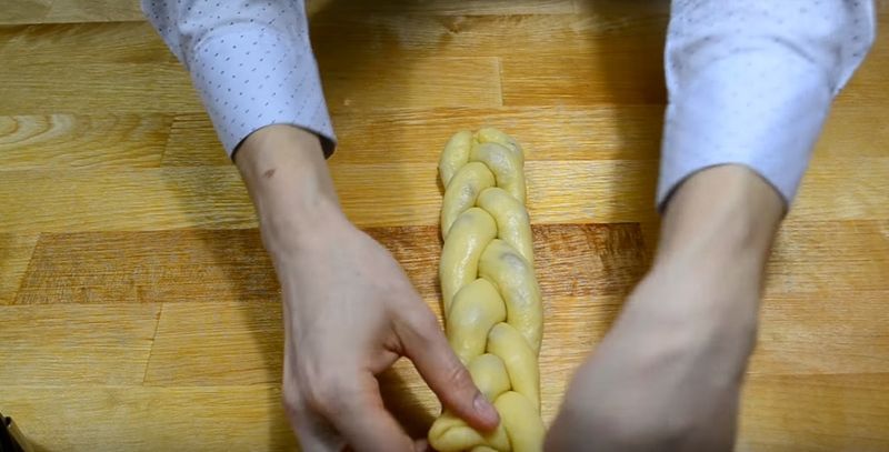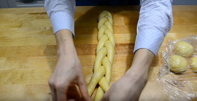 Procedăm la fel și cu bilele mai mici de aluat, așezăm împletitura în centrul tăvii.