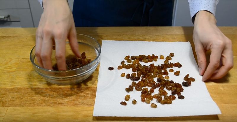 Opărim stafidele cu apă clocotită timp de 15 minute, le spălăm bine și le întindem apoi pe un prosop de hârtie.