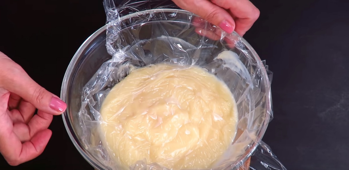 strong>2. Punem compoziția la fiert, pe foc mic. Amestecăm energic până la omogenizare. După ce am obținut o cremă fină și densă, adăugăm esența de vanilie și luăm vasul de pe foc. Punem crema la frigider pentru 2-3 ore.