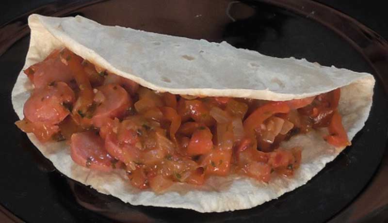 1. Taiem in cubulete ceapa, rosia, ardeiul (poate fi tocat si julienne) iar crenvurstii ii taiem felii