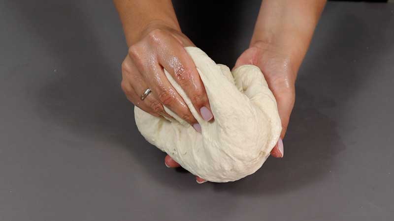 Când întreaga făină este integrată și aluatul s-a format într-un bulgăre, adăugați uleiul rămas și frământați aluatul timp de 3-4 minute. Aluatul trebuie să fie moale, elastic, să se întindă ușor și să nu se lipească prea mult de mâini. Este preferabil ca aluatul să fie ușor lipicios decât să fie prea uscat.