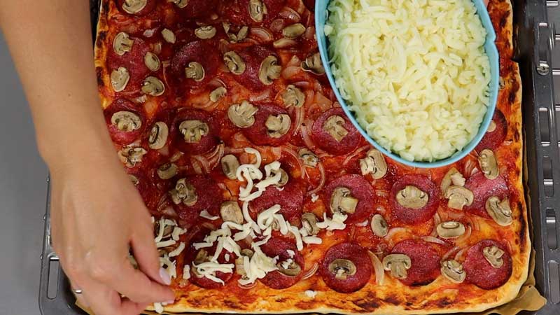 Pentru a adăuga brânza, presărați-o pe pizza la sfârșitul coacerii. Brânza se va topi și va rămâne moale, fără a se face crustă.