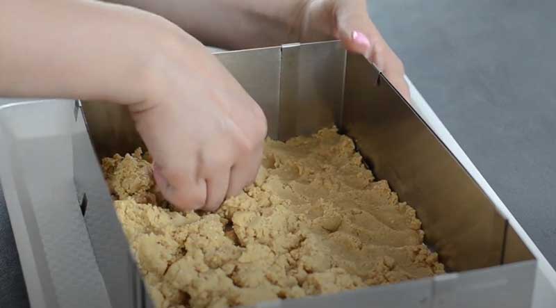 Distribuie amestecul uniform într-o tavă tapetată cu hârtie de copt, presând bine.