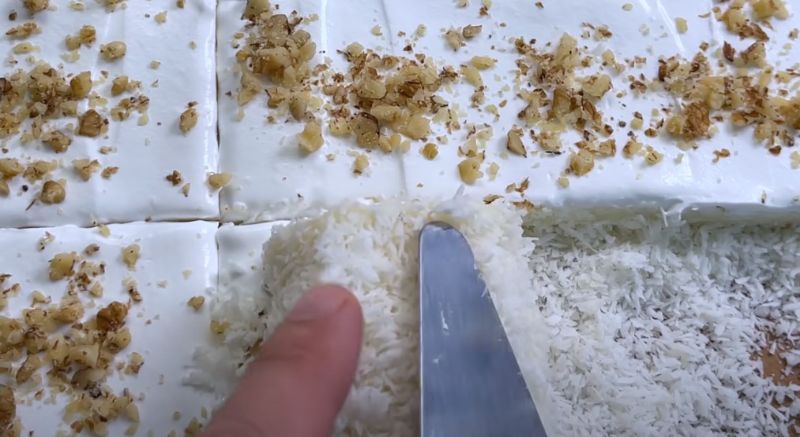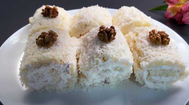 Presarati peste acest desert cu nucă macinata iar apoi tăiați prajitura dreptunghiuri și îndoiți fiecare într-o mini ruladă, cu nuci înăuntru. Decorati suplimentar cu fulgi de nuca de cocos.