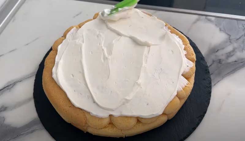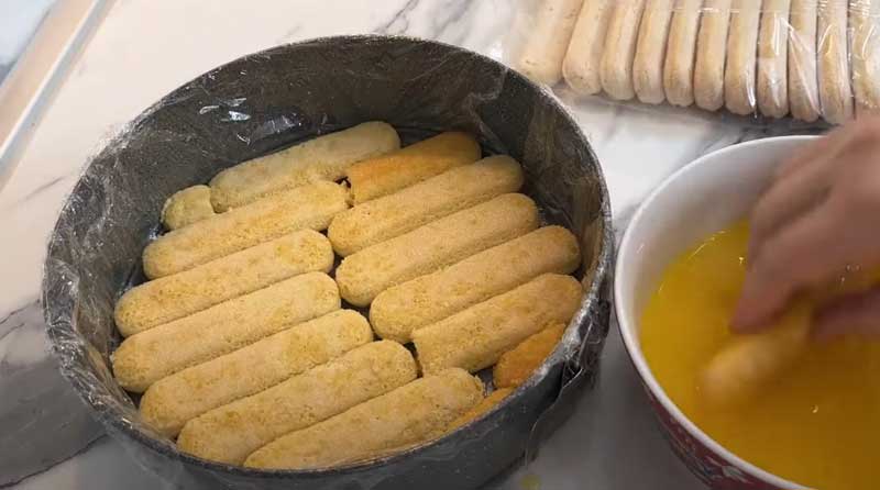 Turnați crema peste pișcoturile din formă. Puneți un alt strat de pișcoturi înmuiate în suc de portocale deasupra.