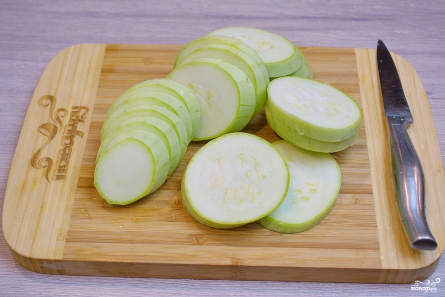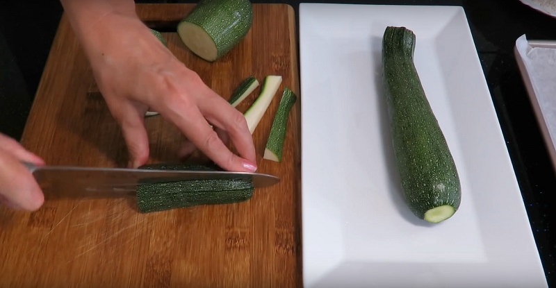 1. Cu ajutorul unui cuțit, tăiem dovleceii pai.