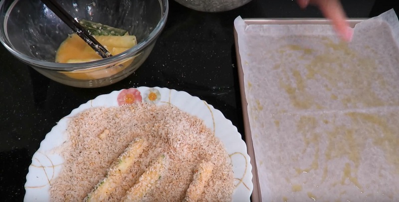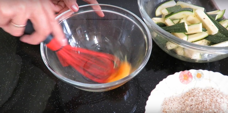 6. Dăm dovleceii prin oul bătut, pe urmă prin amestecul de pesemeți.