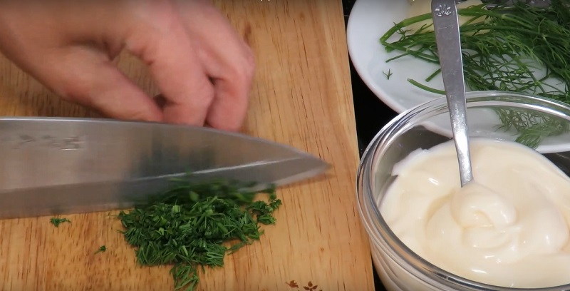 2. Într-un bol, turnăm maioneza. Adăugăm usturoiul zdrobit și amestecăm foarte bine. Tapetăm fiecare felie de dovlecel cu sosul obținut.
