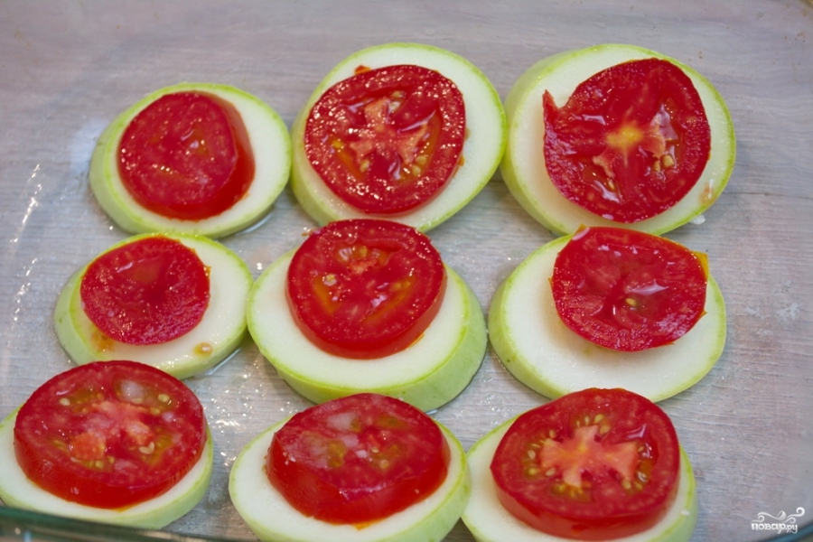 3. Cu ajutorul unui cuțit, tăiem roșiile rondele. Le așezăm pe feliile de dovlecel, pregătite anterior.