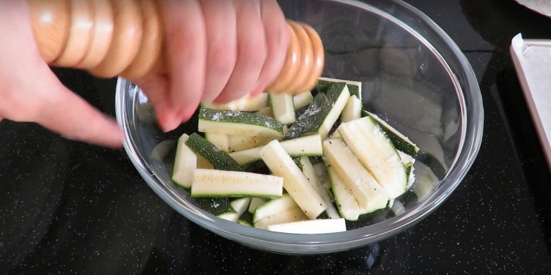 1. Pentru început, spălăm dovleceii, pe urmă îi tăiem rondele. Îi așezăm pe o tavă de copt și îi condimentăm.