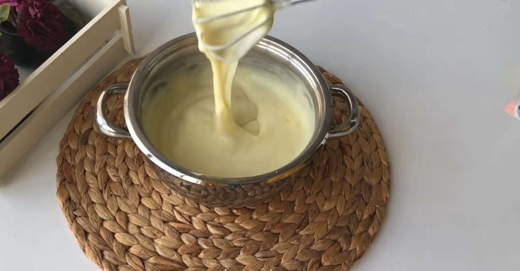 Pentru cremă, turnăm laptele într-o oală. Adăugăm făina, amidonul, zahărul și gălbenușul. Mixăm bine și punem oala pe foc mediu până crema se îngroașă.