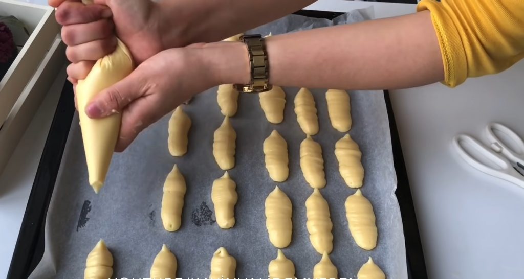 Transferăm aluatul într-un poș și formă cojile pe o tavă tapetată cu hârtie de copt. Dăm tava la cuptorul preîncălzit la 200 de grade pentru 25 de minute. Este foarte important să nu deschidem ușa cuptorului în primele 15 minute.