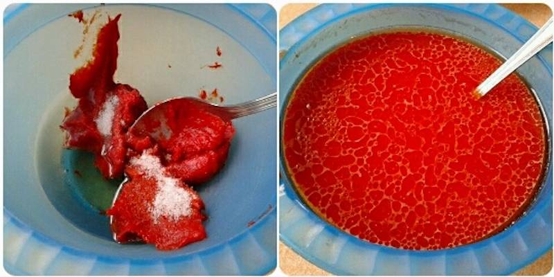 Amestecam 2 linguri de piure de rosii cu 1 lingura pasta de ardei iute, sare, ulei si apa. Amestecam bine pentru a se combina ingredientele.