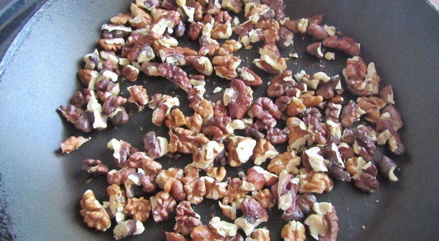 5. Uscăm miezul de nucă într-o tigaie pe urmă îl așezăm pe un prosop uscat. Mărunțim miezul de nucă.