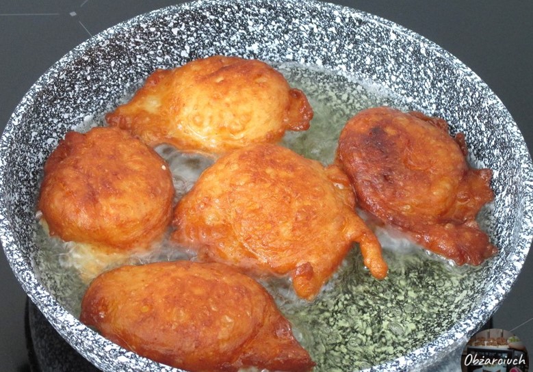 După acest timp, încălzim uleiul în tigaie și cu o lingură punem porții de aluat. Este bine să uzi lingura cu ulei înainte de a pune aluatul. Clătitele se prăjesc până devin rumene pe ambele părți. După prăjire, punem clătitele pe un prosop de hârtie pentru a scurge excesul de ulei.
