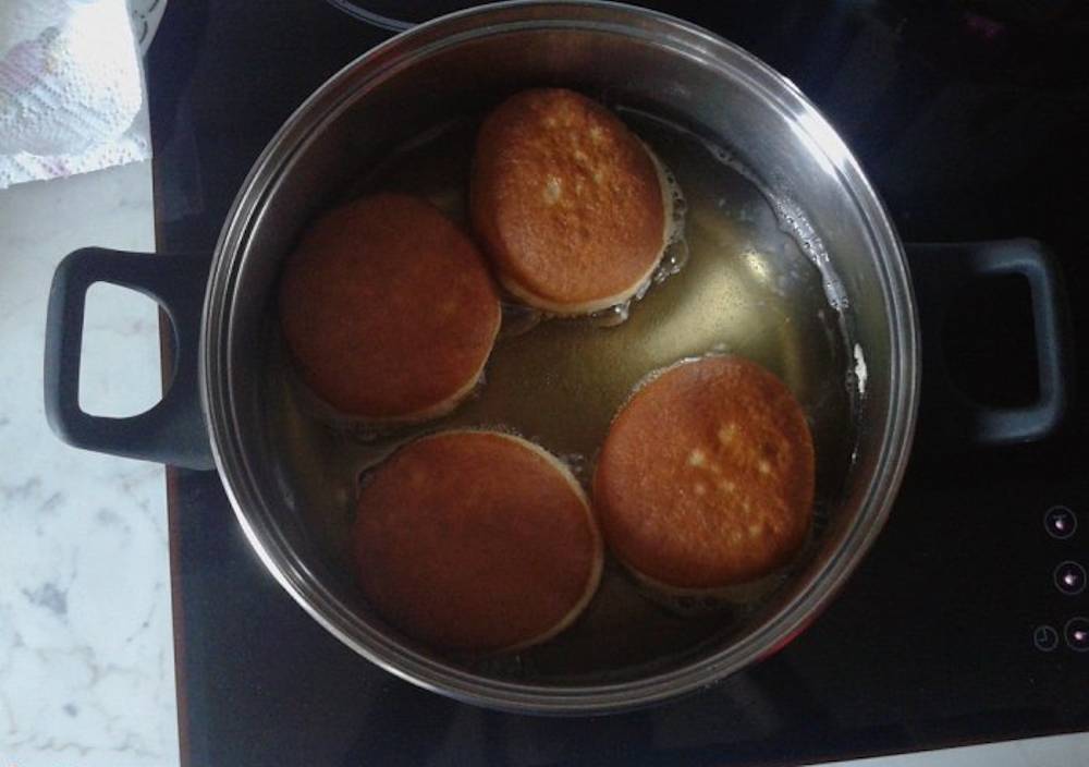 Pune ulei intr-o tigaie si lasa-l sa se infierbante. Dupa ce uleiul s-a incins, pune gogosile in tigaie. Acopera tigaia cu un capac si lasa gogosile sa se prajeasca pe o parte. Intoarce apoi gogosile pe cealalta parte si nu le mai acoperi.