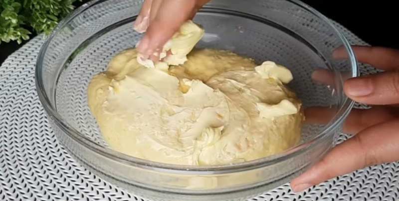 Se toarnă jumătate din făină și sare, se amestecă compozitia cu o spatulă de silicon. Adăugând treptat făina, frământați aluatul. Se adauga apoi untul moale si se framanta bine aluatul. Se acopera cu o folie si se lasa sa creasca timp de o ora.