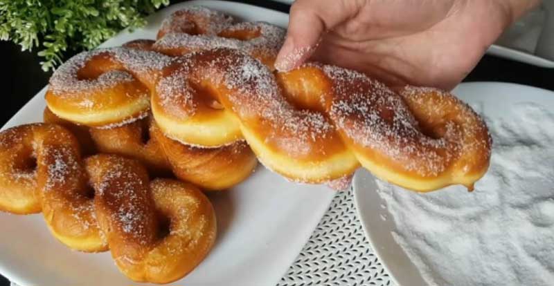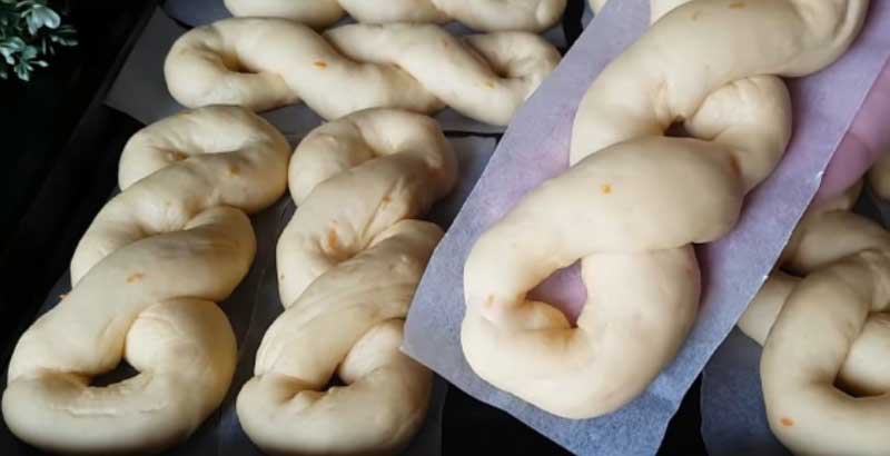 Scoateti aluatul din bol și împărțiți-l în 9 părți egale. Rasuciti fiecare bucata de aluat intr-un fir subțire și faceti-i o „împletitură”, așa cum puteti vedea in fotografie. Puneți gogosile pe hârtie de copt și lăsați sub un prosop timp de 30 de minute.