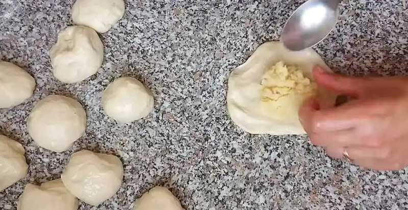 Ung mâinile și aluatul cu ulei și mai frământ puțin. Împart în bucăți și formez biluțe. Apoi fac foi rotunde și adaug umplutura. Am folosit acum niste piure de cartofi, dar umplutura poate fi oricare preferată de voi.