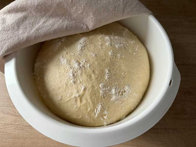 Presărați ușor aluatul frământat cu făină, acoperiți-l cu un prosop curat și uscat și lăsați-l să crească într-un loc cald timp de aproximativ 50 de minute.